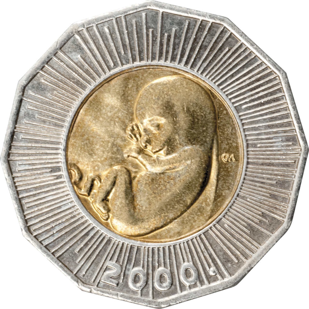 Motif on the obverse: the coin's core carries an image of a fetus, a universal symbol of human life, at the centre of both the millennium that ends and the new millennium that begins, which is symbolized by a sequence of rays within the coin's ring. The year 2000 is placed centrally at the lower part of the coin ring.