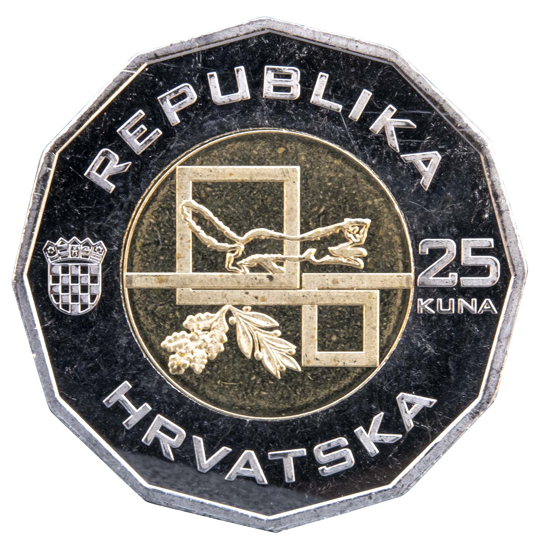 Motif on the reverse: the inner part of the core features two squares, one bigger than the other, bringing into mind the coat of arms of the Republic of Croatia and two parts of the territory of the Republic of Croatia which, shaped and connected in one stroke, are positioned in a way that symbolises road connections in the territory of the Republic of Croatia. A common oak branch with acorns and a blooming laurel branch are positioned below the bigger square, within the inner part of the core. The outlines of the bigger square reveal an image of a marten turned to the right, with the image continuing outside of the square, above the symbolic, imaginary line of the bridge and the smaller square. Positioned to the left from the marten, on the coin’s ring surface, is an image of the coat of arms of the Republic of Croatia and positioned to the right is the denomination numeral “25”, with the name of the monetary unit “KUNA” inscribed below the numeral. The inscription “REPUBLIKA” is laid out semi-circularly above the core, on the coin’s ring surface, while the inscription “HRVATSKA” is laid out below the core, on the ring’s surface.