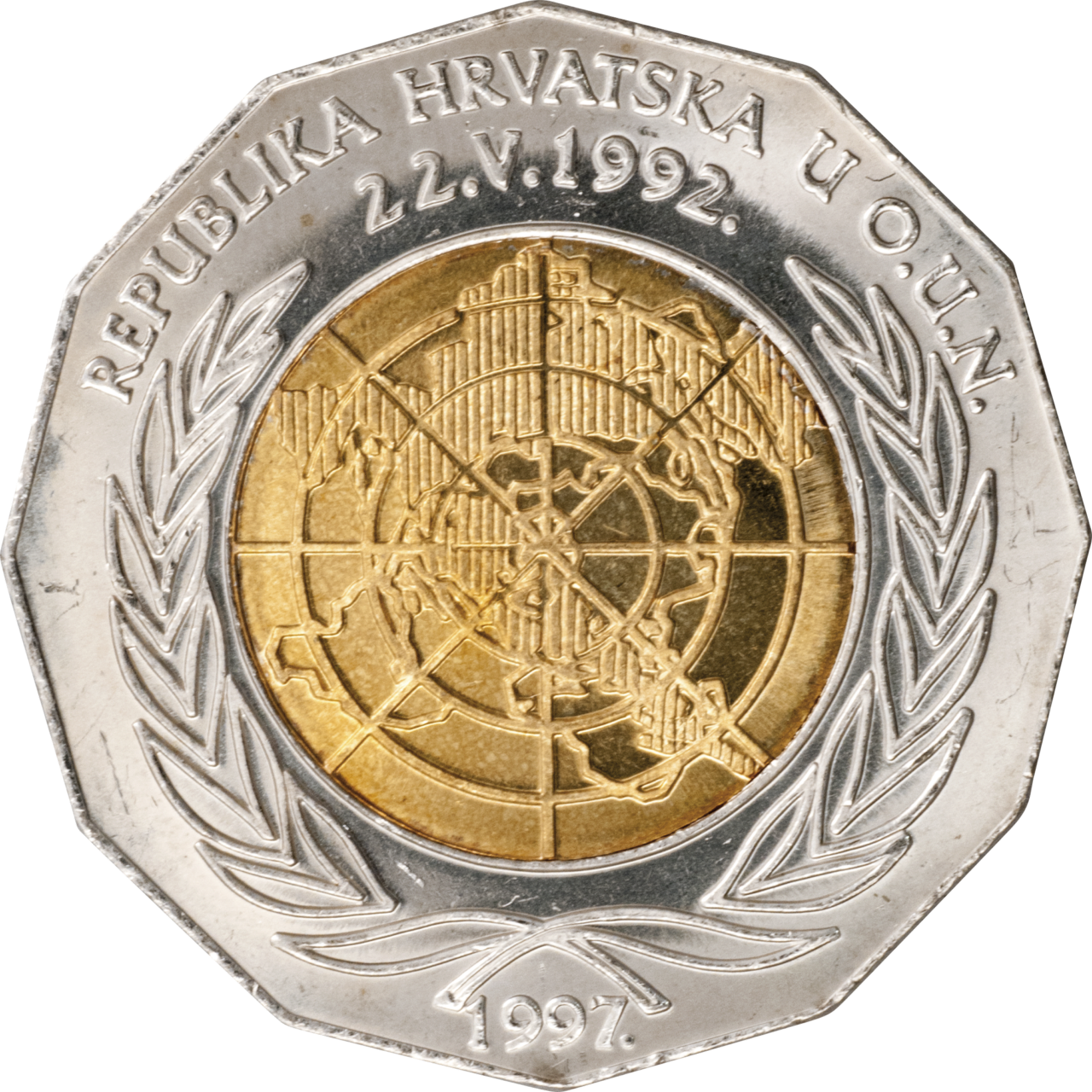 Motif on the obverse: the core and the ring of the coin carry the emblem of the United Nations Organization, featuring a map of the world within the core, and a particularly distinct relief of the Republic of Croatia. The image within the core is framed by stylized olive branches placed within the ring of the coin. The inscriptions "REPUBLIKA HRVATSKA U O.U.N." and the date of admission of the Republic of Croatia to the UNO "22. V. 1992." are shown in two lines above the emblem. Placed centrally below the symbol along the lower edge of the coin is the minting year "1997".