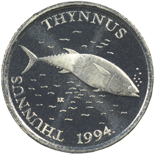 Motiv na naličju: U središnjem dijelu prikaz tunja, velike ribe koštunjače iz porodice tunjeva. U pozadini niz sitnih ornamenata koji simboliziraju morsku vodu. U gornjem polukrugu, uz rub, natpis "TUNJ" (lat. "THUNNUS THYNNUS"). Uz donji rub, u središnjem dijelu, godina kovanja.