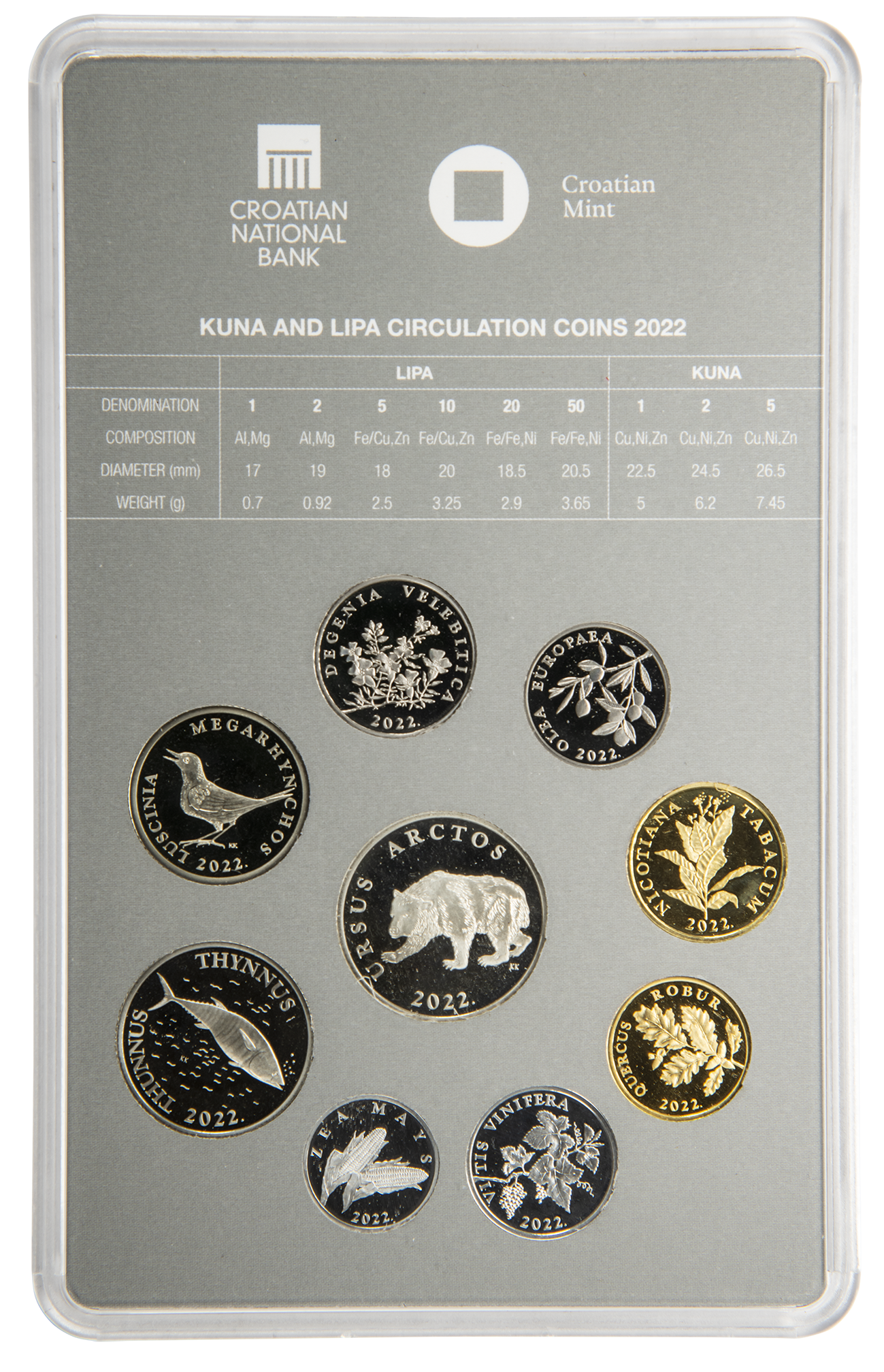 Kao i dosadašnji kompleti, u ovaj komplet uloženi su apoeni optjecajnoga kovanog novca od 5, 2 i 1 kune te 50, 20, 10, 5, 2 i 1 lipe, koji su pušteni u optjecaj u tekućoj godini.