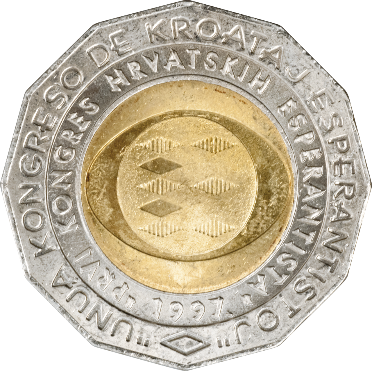 Motif on the obverse: the central part of the coin's core carries the symbol of the Congress, an elliptic circle within which eight elongated rhombs are placed in two vertical columns, pointing at one another with their tips. Of the five rhombs in the left column, the third and the fifth are filled with vertical lines. The right column contains three rhombs, all filled with vertical lines, symbolizing the red and white fields of the Croatian historical coat of arms. All eight rhombs are connected, forming the capital letter "E" (i.e. Esperanto). An identical rhomb is placed centrally at the lower part of the ring, with the inscription "UNUA KONGRESO DE KROATAJ ESPERANTISTOJ" beginning on the left side of the rhomb and stretching along the ring to the its right side. The second, inner, strip of the ring's surface features the inscription "PRVI KONGRES HRVATSKIH ESPERANTISTA", separated by the minting year, "1997", placed centrally in the lower part of the strip, above the elongated rhomb.