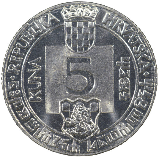 Motif on the obverse: The centre of the coin features a square surrounded by a circle, with number "5" inside the square. The name of the monetary unit "KUNA" is inscribed in the Latin script along the left edge of the square and in the Glagolitic script along its right edge. Positioned centrally in the upper semi-circle, above the square, is the coat of arms of the Republic of Croatia, whose crest penetrates the strip between the coin edge and the circle surrounding the square in the centre. The lower part of the coat of arms of the Republic of Croatia partially penetrates the central square. The coat of arms of the City of Senj, positioned centrally below the square in the centre, penetrates the square with its upper part, while its lower part covers the circle surrounding the square. The inscription "REPUBLIKA HRVATSKA" is laid out in the Latin script in the upper part of the strip between the coin edge and the circle surrounding the square in the centre. The same inscription, but in the Glagolitic script, is displayed in the lower part of the strip between the coin edge and the circle surrounding the square in the centre.