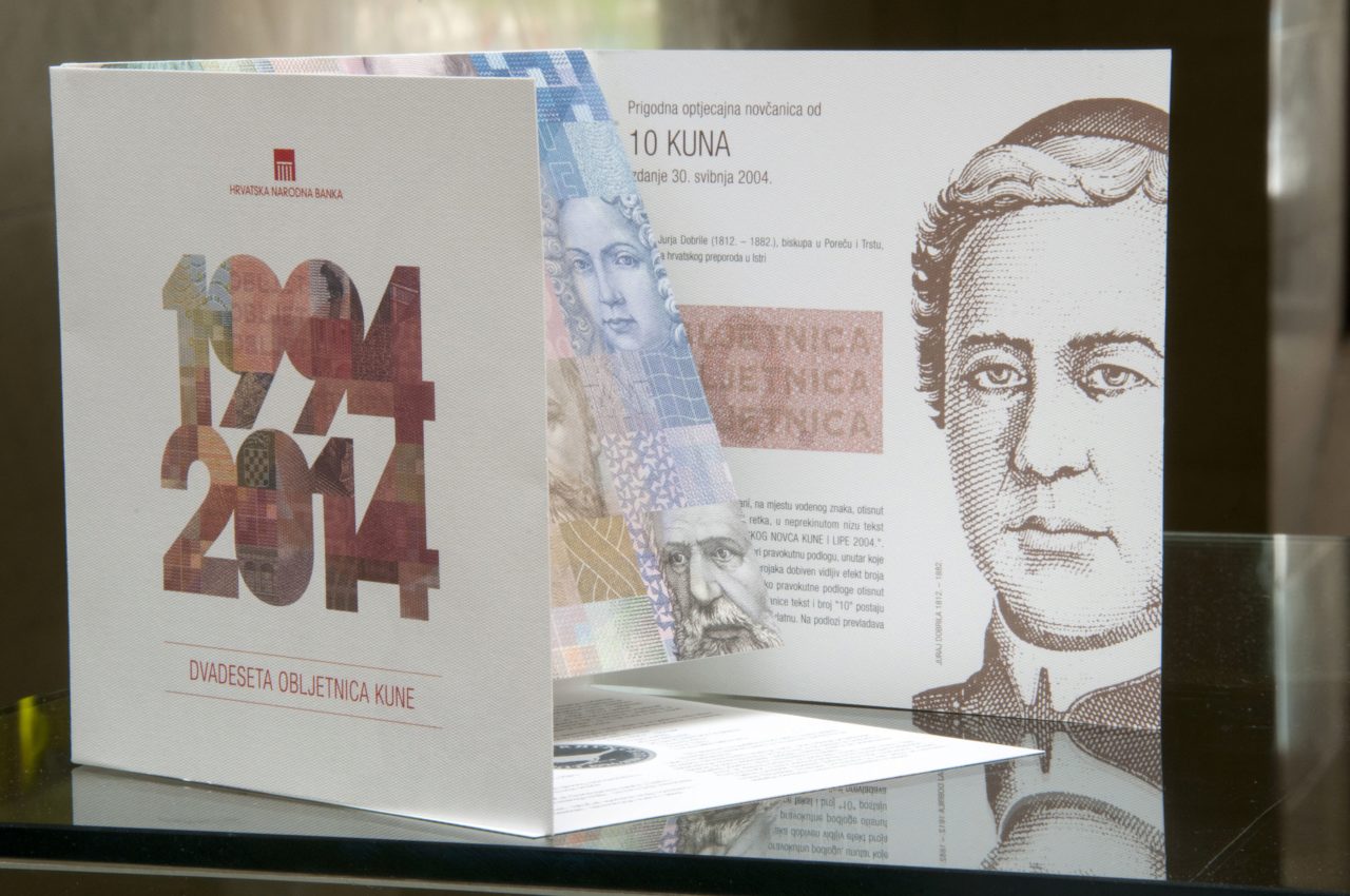 A set consisting of a commemorative 10-kuna circulation banknote, issue 2004, and a commemorative 20-kuna circulation banknote, issue 2014, was released for sale to mark the 20th anniversary of the introduction of the kuna as the monetary unit of the Republic of Croatia.