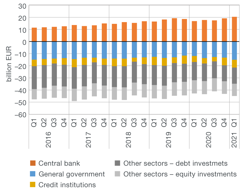 The sharp increase in external debt liabilities of domestic sectors was largely offset by the increase in foreign assets, primarily of gross international reserves and government claims based on the difference between the funds distributed to end users and the funds received from the EU budget. Thus, net external debt increased by EUR 0.8bn in the first three months of 2021 and stood at EUR 8.3bn at the end of March, i.e. at 16.8% of GDP, which was 1.7 percentage points more than at the end of 2020.