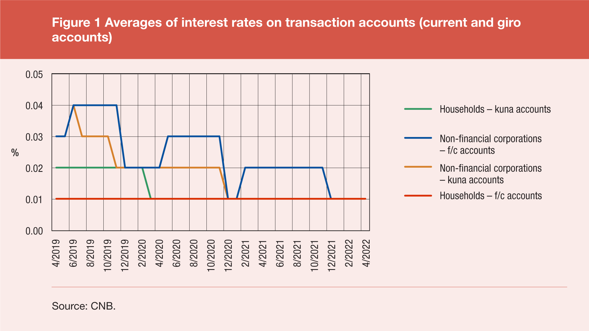 As regards transaction accounts (current and giro), the average of interest rates on kuna and foreign currency accounts of non-financial corporations and households in April 2022 was approximately at the same level as in April 2021, while all four averages stood at 0.01%.