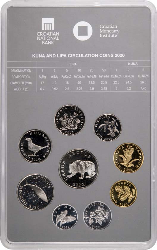 The Croatian National Bank issued a numismatic set of Croatian kuna and lipa circulation coins, with mint year 2020. The Decision on the issue of the numismatic sets of Croatian kuna and lipa circulation coins with mint year 2020 was published in the Official Gazette No. 138/2020.