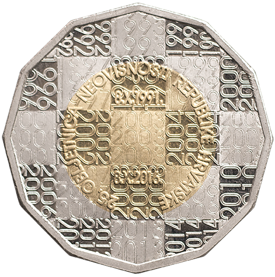 Motiv na licu: na plohi kovanog novca naizmjenični je prikaz svijetlih i matiranih kvadrata unutar kojih su u pozitivu i negativu ispisane godine, koje simboliziraju dvadesetpetogodišnje razdoblje neovisnosti Republike Hrvatske. Kružno uz rub jezgre ispisan je u pozitivu tekst »25. OBLJETNICA NEOVISNOSTI REPUBLIKE HRVATSKE«. Iznad središnjega kvadrata ispisan je u pozitivu datum »8.X.1991.«, a ispod središnjega kvadrata, također u pozitivu, datum »8.X.2016.«.