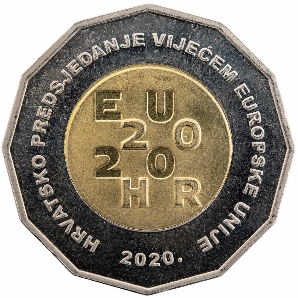 Motiv na licu: Unutar jezgre kovanog novca nalazi se prikaz službenog logotipa "Tipografska šahovnica" u povodu predsjedanja Republike Hrvatske Vijećem Europske unije 2020., koji se, kao tipografsko rješenje, sastoji od slova i brojki čiji međusobni položaj asocira na polja grba Republike Hrvatske. Kompozicijski, kraticama "HR" i "EU" te godinom predsjedanja "2020.", prenosi poruku povezanosti Hrvatske i Europske unije. Kružno, unutar prstena, ispisan je tekst "HRVATSKO PREDSJEDANJE VIJEĆEM EUROPSKE UNIJE". Ispod jezgre, na površini prstena kovanog novca nalazi se ispis godine izdanja "2020.".