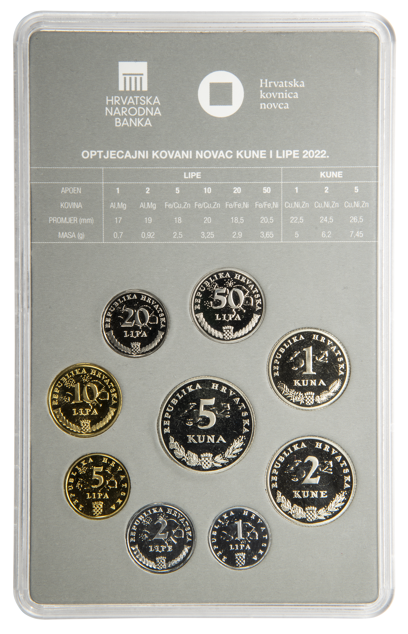 Kao i dosadašnji kompleti, u ovaj komplet uloženi su apoeni optjecajnoga kovanog novca od 5, 2 i 1 kune te 50, 20, 10, 5, 2 i 1 lipe, koji su pušteni u optjecaj u tekućoj godini.