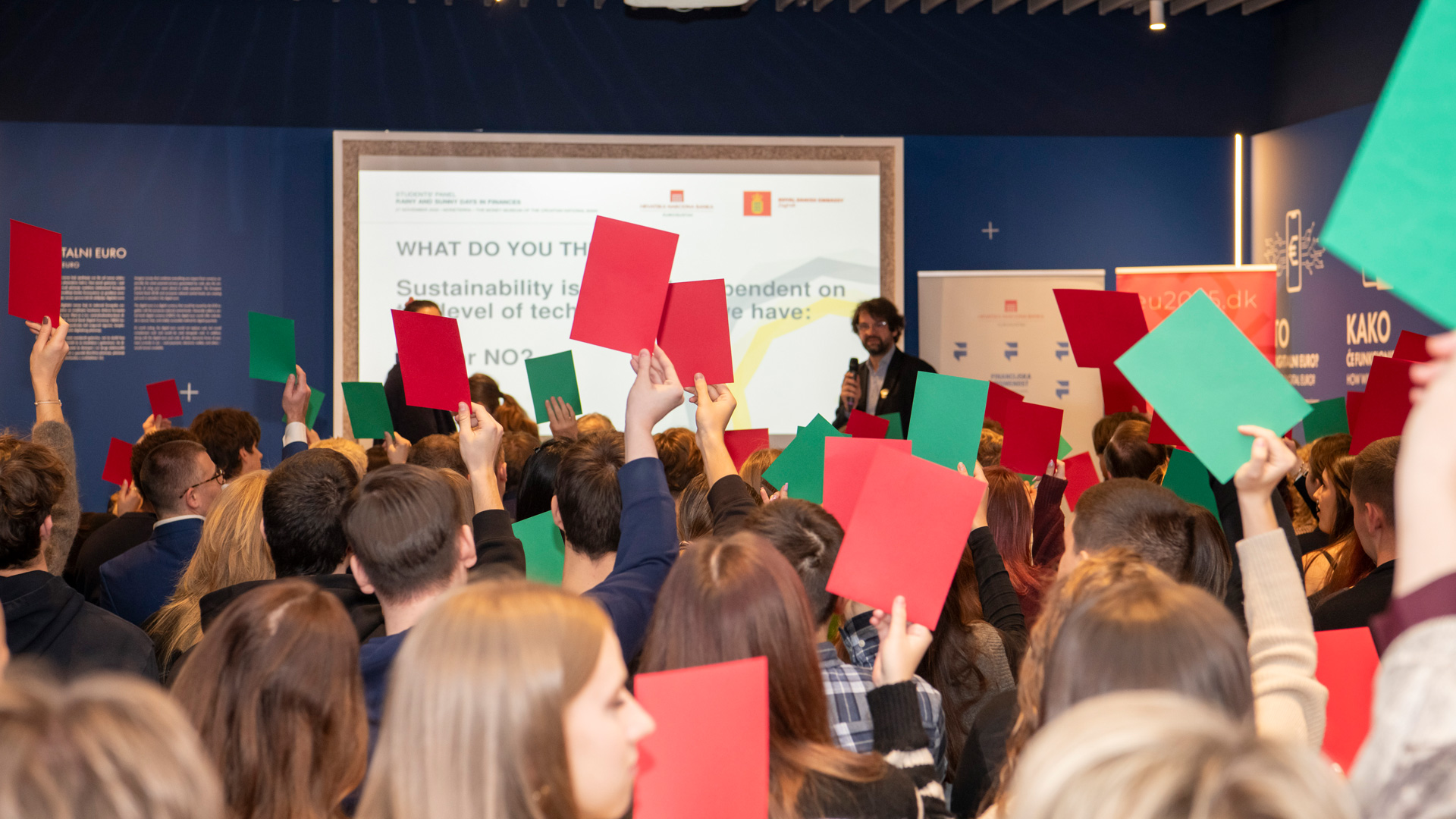 Hrvatska narodna banka i veleposlanstvo Kraljevine Danske organizirali su danas učenički panel "Kišni i sunčani dani u financijama" (engl. Rainy and Sunny Days in Finances) posvećen aktualnim pitanjima održivosti u financijama. Panel je okupio učenike iz Danske – zemlje koja upravo predsjeda Vijećem EU, i Hrvatske. Učenici su raspravljali o izazovima održivih osobnih financija, ekološkoj odgovornosti u financijskim odlukama te prognozama za budućnost financijskih tržišta, uzimajući u obzir klimatske promjene i globalne ekonomske trendove. Moderator razgovora bio je Boris Jokić, vodeći hrvatski ekspert za obrazovanje, ravnatelj Instituta za društvena istraživanja u Zagrebu, i poznati DJ na radiju Yammat.